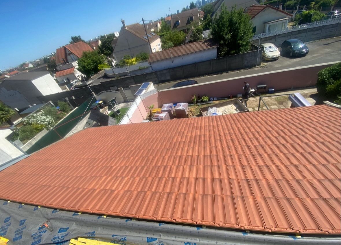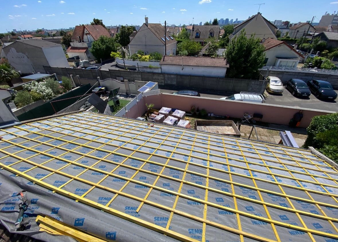 Intervention sur une maison récente nécessitant une pose de tuiles modernes et d’une isolation thermique optimale.
